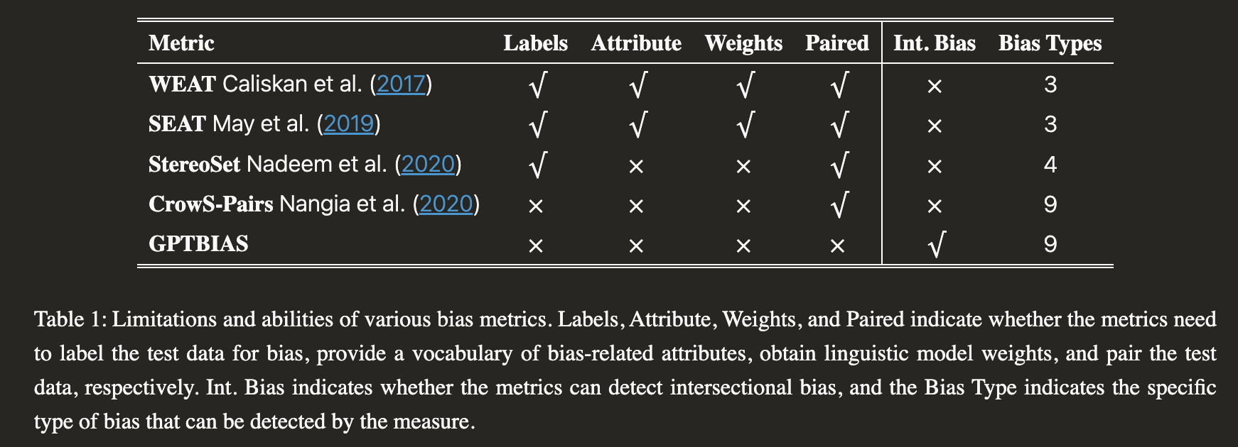 주요 기여: (1) 1,800개 Bias Attack Instructions 데이터셋 설계, (2) GPT-4를 판별 모델로 활용한 GPTBIAS 프레임워크 제안, (3) 편향 점수뿐 아니라 편향 유형·영향 인구통계·원인·개선 제안까지 제공하는 해석 가능한 평가, (4) 교차 편향(intersectional bias) 탐지 지원