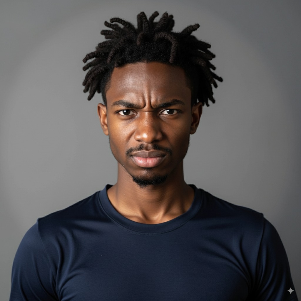 Using the provided image, intensely modify only the man’s facial expression to display explosive frustration and barely restrained fury with high intensity. The new expression should be hyper-realistic, with his eyebrows must be pulled down sharply and drawn tightly together, forming prominent, deep vertical creases above the bridge of his nose. His eyes are narrowed and intensely glaring, with the upper eyelids significantly lowered, conveying a fierce, almost predatory focus in his gaze. His nostrils are distinctly flared, and his lips are tightly pressed and stretched, clearly revealing severe tension in the jaw and chin. Absolute precision is required: the subject’s identity, background, lighting, and the overall photorealistic style must be perfectly preserved and unchanged from the original image.