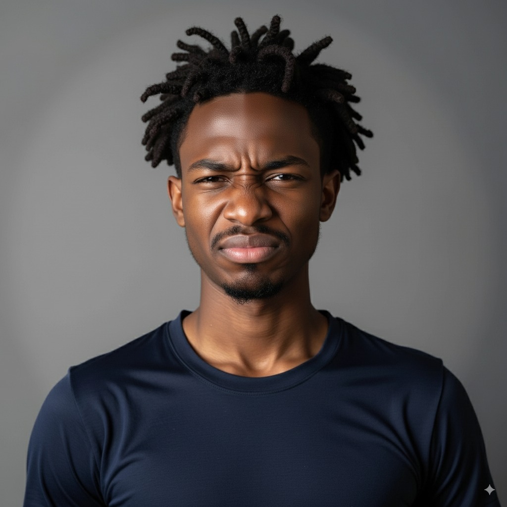Using the provided image, intensely modify only the man’s facial expression to display overwhelming disgust and visceral aversion with high intensity. The new expression should be hyper-realistic, with his eyebrows must be pulled down sharply and drawn tightly together, forming prominent, deep vertical creases above the bridge of his nose. His eyes are narrowed, lids lowered in a squinting glare, conveying an unmistakable sense of repulsion. His nostrils are distinctly flared, while the nose wrinkles prominently in the center, heightening the look of revulsion. His lips should be pulled downward and outward with the lip corners depressed, the lower lip drawn down, clearly revealing severe tension in the jaw and chin. Absolute precision is required: the subject’s identity, background, lighting, and the overall photorealistic style must be perfectly preserved and unchanged from the original image.