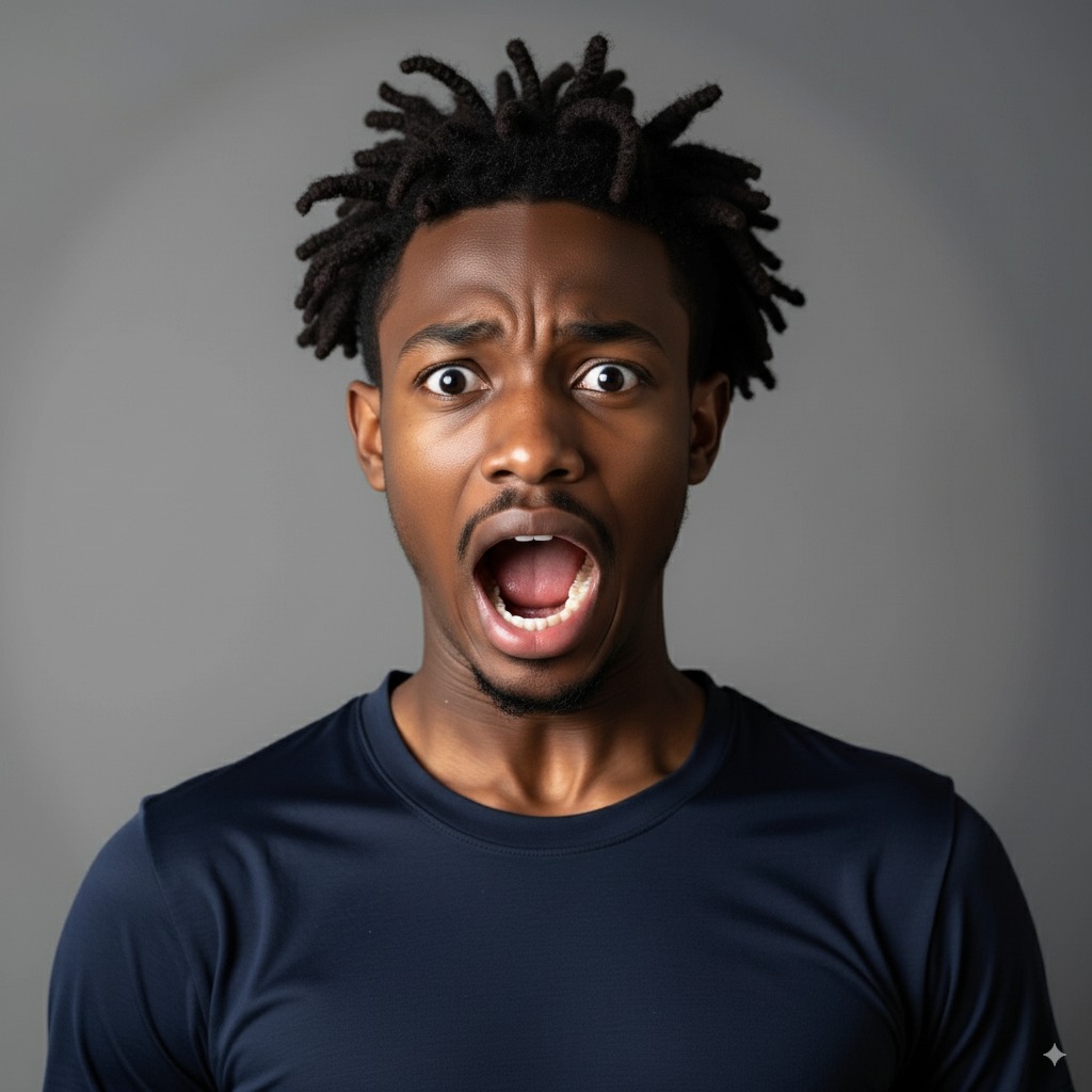Using the provided image, intensely modify only the man’s facial expression to display someone utterly frozen in a moment of intense, overwhelming panic with high intensity. His eyebrows must be raised high and pulled together tightly, forming prominent, strong vertical wrinkles above the nose. His upper eyelids are stretched wide, fully exposing the whites of his eyes, while the lower lids are visibly tensed. His mouth is wide open and jaw dropped, as if gasping for air or about to let out a scream. The entire face should be taut with extreme alarm and a sudden, powerful surge of terror. Absolute precision is required: the subject’s identity, background, lighting, and the overall photorealistic style must be perfectly preserved and unchanged from the original image.
