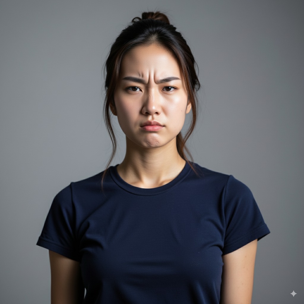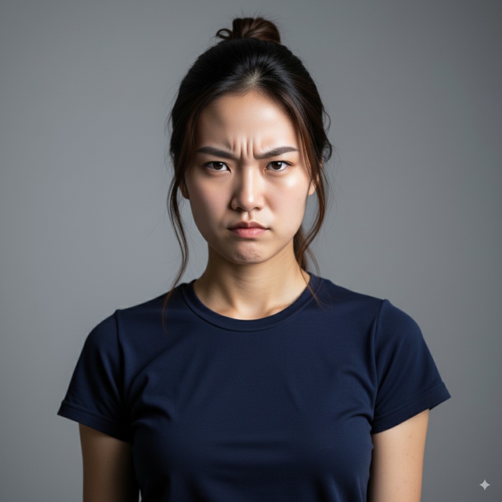 Using the provided image, intensely modify only the woman’s facial expression to display explosive frustration and barely restrained fury with high intensity. The new expression should be hyper-realistic, with her eyebrows must be pulled down sharply and drawn tightly together, forming prominent, deep vertical creases above the bridge of her nose. Her eyes are narrowed and intensely glaring, with the upper eyelids significantly lowered, conveying a fierce, almost predatory focus in her gaze. Her nostrils are distinctly flared, and her lips are tightly pressed and stretched, clearly revealing severe tension in the jaw and chin. Absolute precision is required: the subject’s identity, background, lighting, and the overall photorealistic style must be perfectly preserved and unchanged from the original image.