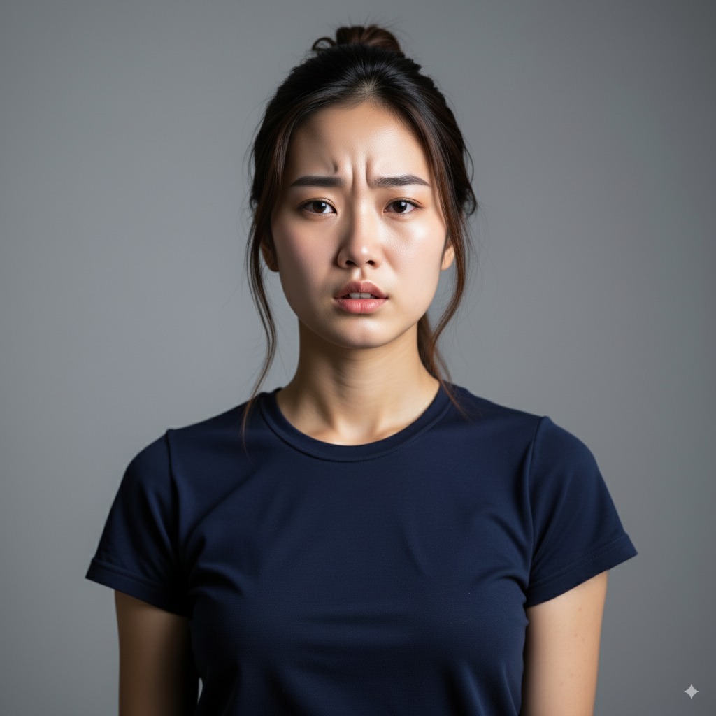 Using the provided image, intensely modify only the woman’s facial expression to depict someone completely overwhelmed by raw, heartfelt sorrow with high intensity. The new expression should be hyper-realistic, with her inner eyebrows must be deeply raised and drawn together, forming sharp, vertical furrows at the top of her nose. Her eyelids should droop heavily over her eyes, giving her gaze an unfocused, distant appearance. The corners of her lips are to be significantly pulled down, and her mouth should be slightly agape as if she is struggling to hold back an imminent sob. Visible tension in her cheeks and chin should communicate this powerful, crushing emotion. Absolute precision is required: the subject’s identity, background, lighting, and the overall photorealistic style must be perfectly preserved and unchanged from the original image.