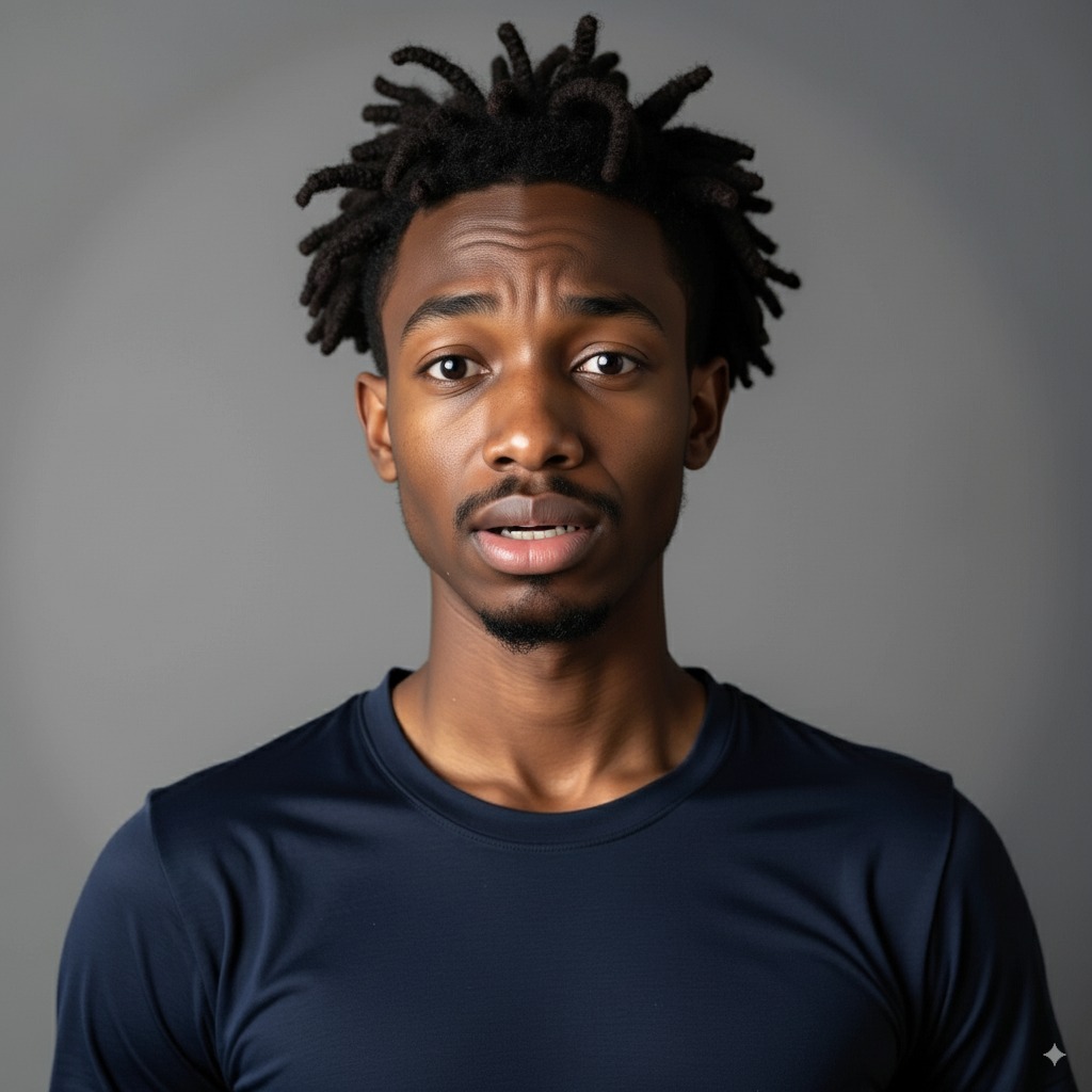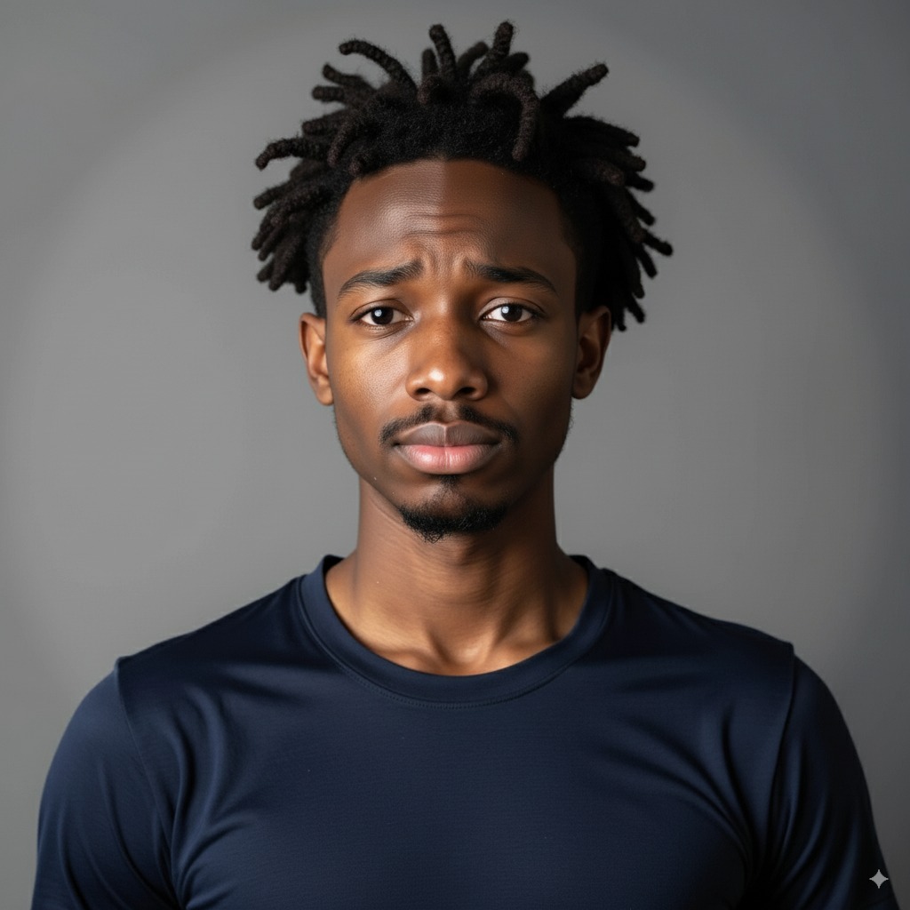 A close-up portrait of the same male with a hint of melancholy. The inner corners of his eyebrows are slightly raised, giving his gaze a contemplative quality. His lips show a very faint downward turn, not quite forming a frown. The overall expression is gentle, almost neutral, but carries a subtle emotional weight. All other features remain unchanged – same person, same background, same lighting – resulting in a photorealistic image that suggests introspective sadness.