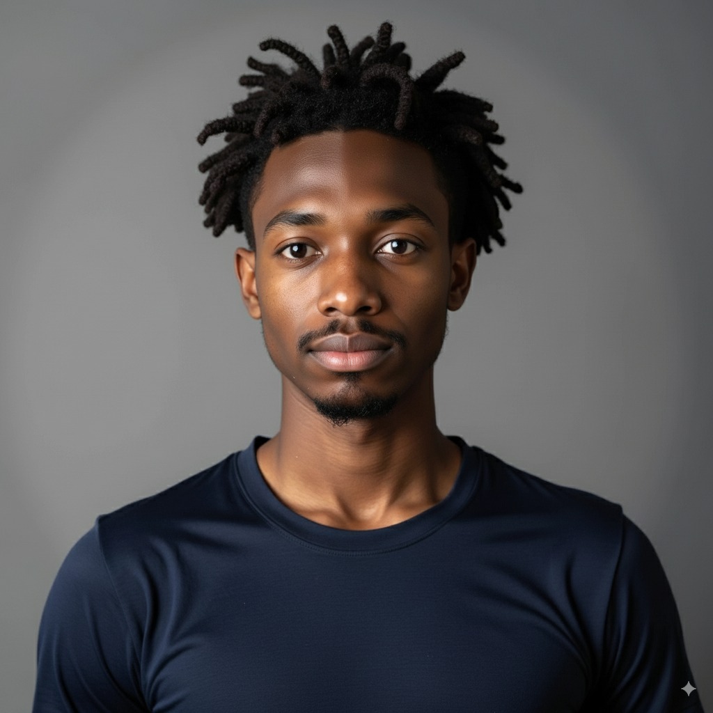 A close-up portrait of the same male with a moderately intense smile. The corners of his lips are clearly lifted into a confident curve, and the muscles around his eyes engage enough to cause slight crow’s feet. His cheeks are noticeably raised, giving his face a warm, energized appearance. All other features remain unchanged – same person, same background, same lighting – resulting in a photorealistic image that conveys a sincere and emotionally present smile.