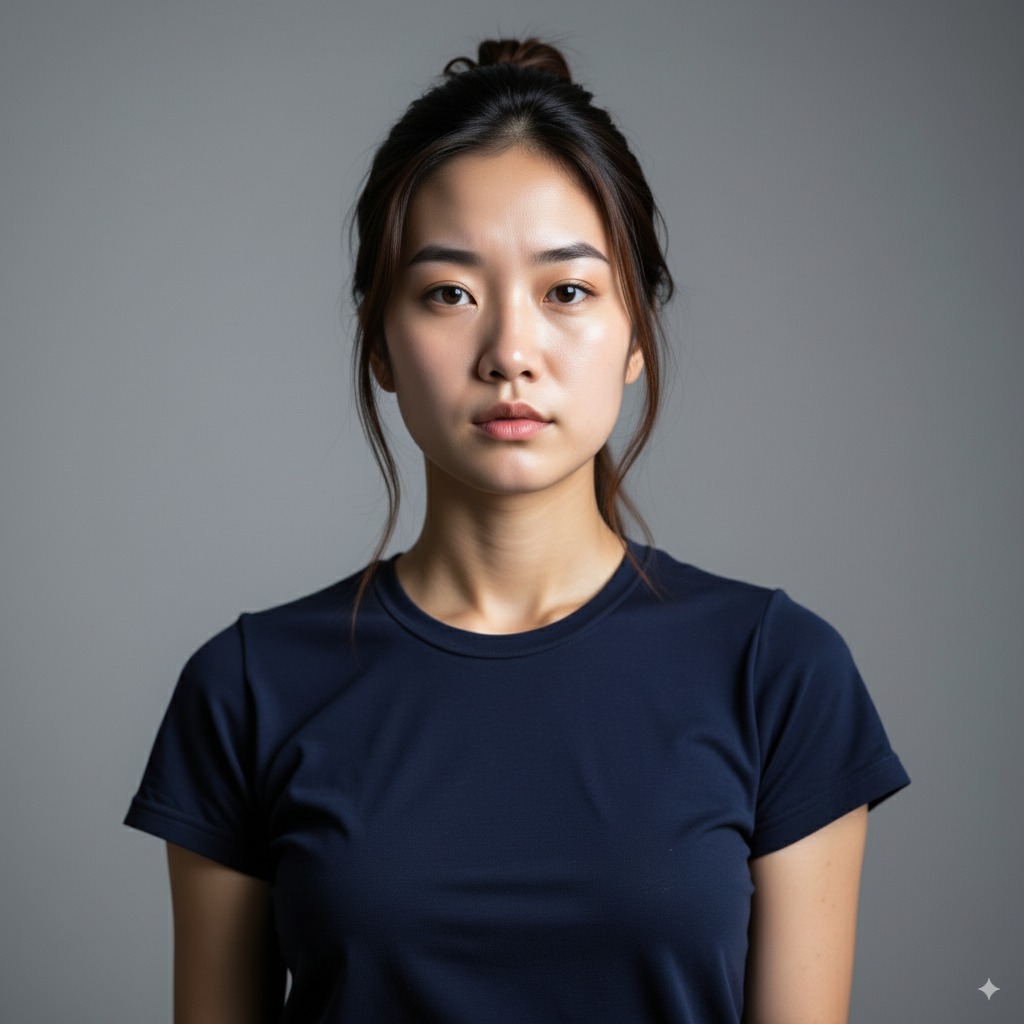Using the provided image, subtly modify only the woman’s facial expression to display a hint of melancholy or introspective sadness with low intensity. The new expression should be hyper-realistic, with the inner corners of her eyebrows should be just slightly raised, lending her gaze a contemplative, thoughtful quality. Her lips should show a very faint, almost imperceptible downward turn, not quite forming a frown but carrying a subtle emotional weight. The overall expression should remain gentle and largely neutral, conveying a quiet, internal sadness. Absolute precision is required: the subject’s identity, background, lighting, and the overall photorealistic style must be perfectly preserved and unchanged from the original image.