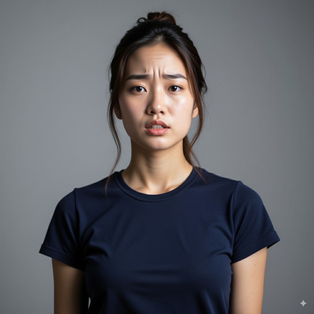 Using the provided image, modify only the woman’s facial expression to display a genuine sadness, communicating a clear sense of emotional heaviness with moderate intensity. The new expression should be hyper-realistic, with the inner corners of her eyebrows should be raised and knitted slightly, forming a soft, visible wrinkle at the top of her nose. Her eyelids must droop subtly, and the corners of her lips should be turned down with noticeable tension around the mouth, suggesting a struggle to maintain composure. Absolute precision is required: the subject’s identity, background, lighting, and the overall photorealistic style must be perfectly preserved and unchanged from the original image.