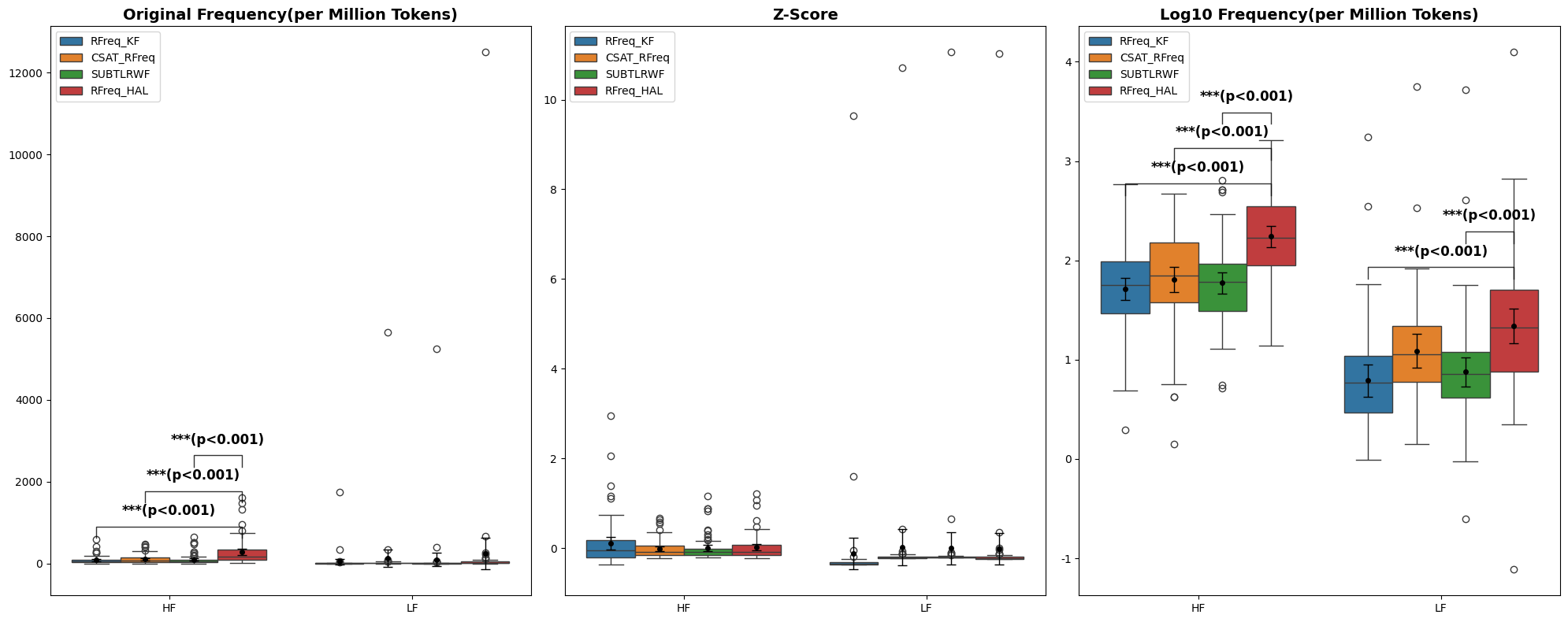 RFreq_HAL vs SUBTLRWF: diff = -185.597, CI[-271.709,-99.484], p = 0.0000 *** (유의함)