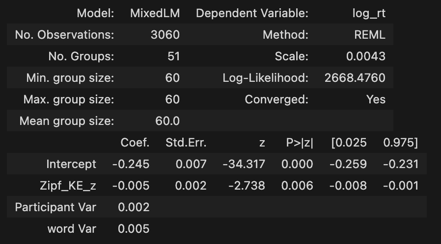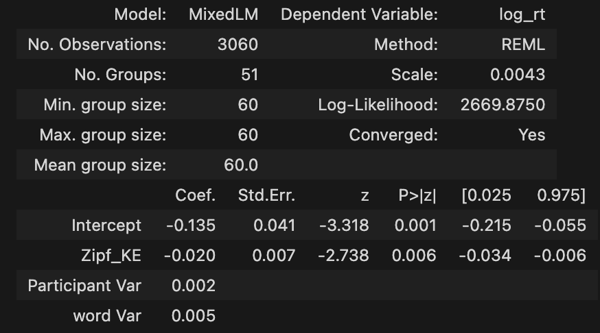 # gender 차이? formula = 'log_rt ~ Zipf_KE' # regression formula vc_formula = { # variance component formula "word": "0 + C(Stimuli)" } re_formula = '~1' # random slope formula model = MixedLM.from_formula(formula, data=KE_cumulative_df, groups='participant_id', vc_formula=vc_formula, re_formula=re_formula ).fit() model.summary()