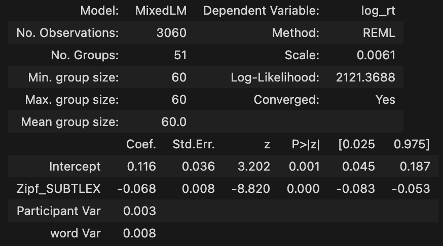# gender 차이? formula = 'log_rt ~ Zipf_SUBTLEX_z' # regression formula vc_formula = { # variance component formula "word": "0 + C(Stimuli)" } re_formula = '~1' # random slope formula model = MixedLM.from_formula(formula, data=SUBTLEX_cumulative_df, groups='participant_id', vc_formula=vc_formula, re_formula=re_formula ).fit() model.summary()