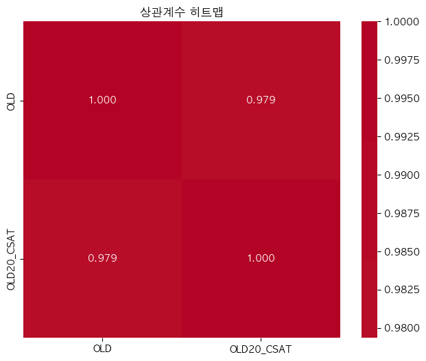 단어 빈도수 상관관계 분석 결과 ================================== 📊 기본 통계: 데이터 개수: 16247 OLD - 평균: -0.00, 표준편차: 1.00 OLD20_CSAT - 평균: -0.00, 표준편차: 1.00 🔗 상관계수: 피어슨 상관계수: 0.9794 (p-value: 0.0000) 스피어만 상관계수: 0.9804 (p-value: 0.0000) 켄달 타우: 0.8961 (p-value: 0.0000) 📝 해석: 통계적 유의성: 매우 유의함 (p < 0.001) 상관관계 강도: 강한 양의 상관관계 ==================================ELP vs KE_EXAM