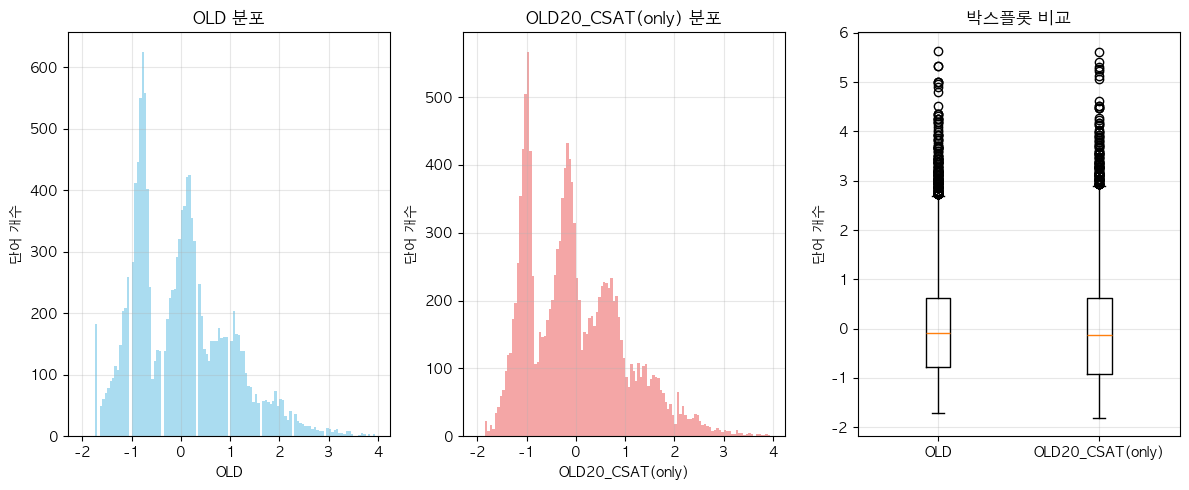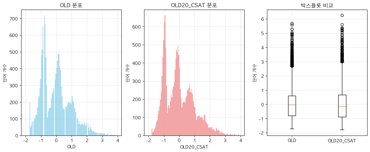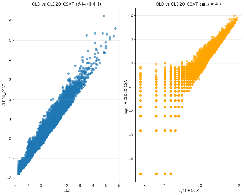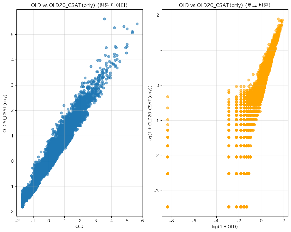 단어 빈도수 상관관계 분석 결과 ================================== 📊 기본 통계: 데이터 개수: 13912 OLD - 평균: -0.00, 표준편차: 1.00 OLD20_CSAT(only) - 평균: 0.00, 표준편차: 1.00 🔗 상관계수: 피어슨 상관계수: 0.9758 (p-value: 0.0000) 스피어만 상관계수: 0.9773 (p-value: 0.0000) 켄달 타우: 0.8852 (p-value: 0.0000) 📝 해석: 통계적 유의성: 매우 유의함 (p < 0.001) 상관관계 강도: 강한 양의 상관관계 ==================================ELP vs KE_TEXTBOOK(수정해야함)