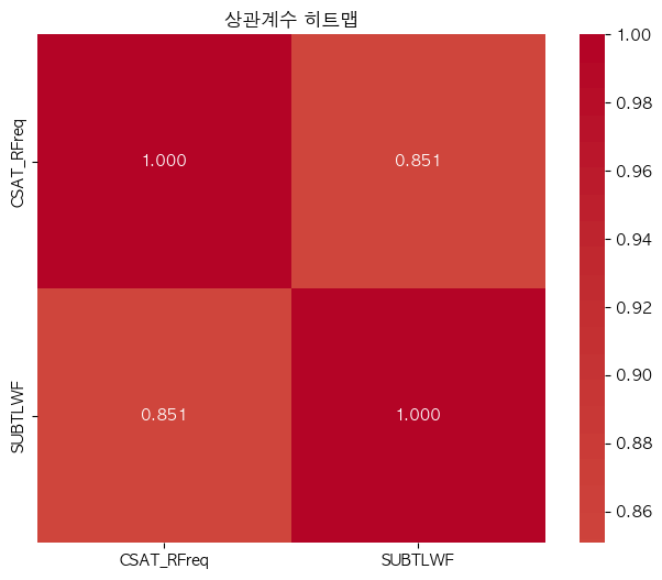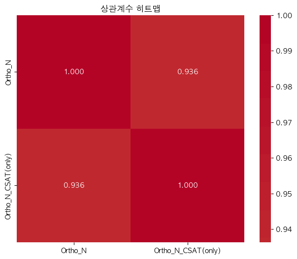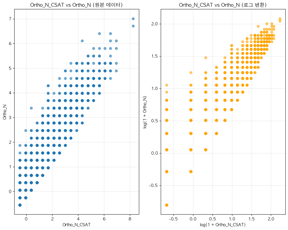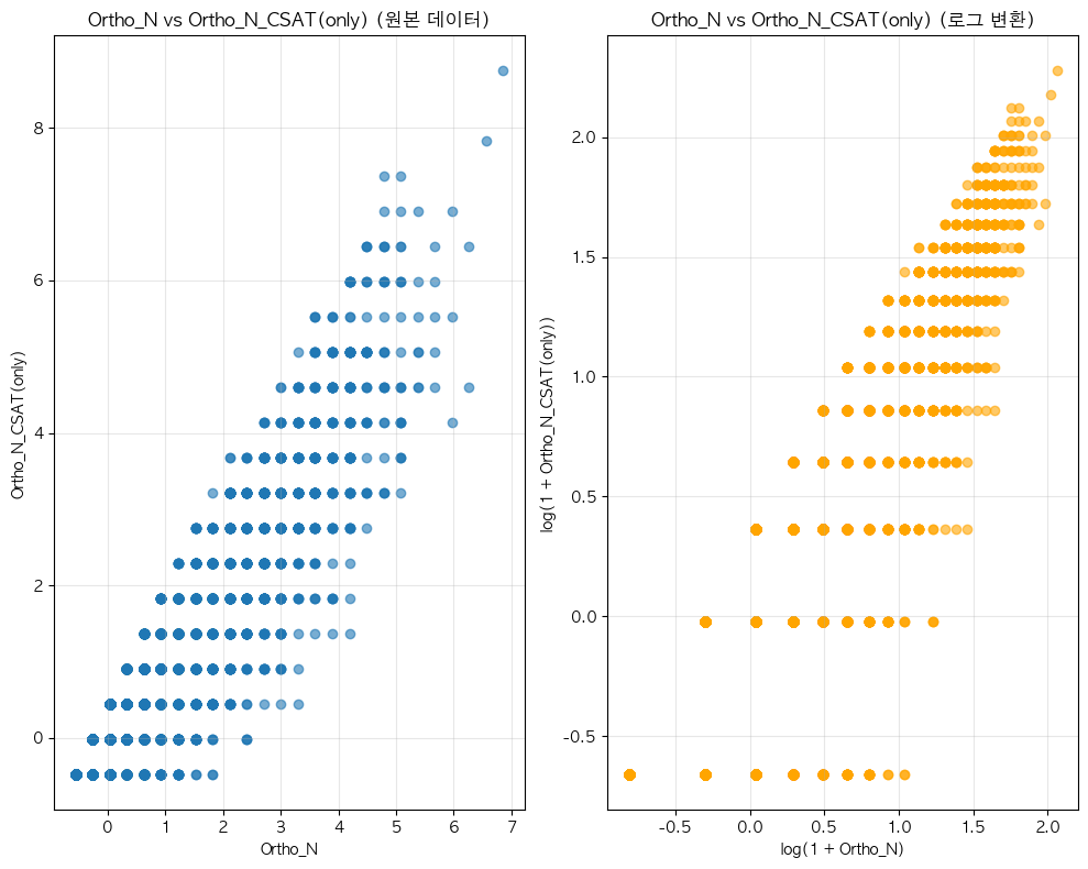 단어 빈도수 상관관계 분석 결과 ================================== 📊 기본 통계: 데이터 개수: ??(수정해야 함.) Ortho_N_CSAT - 평균: -0.00, 표준편차: 1.00 Ortho_N - 평균: 0.00, 표준편차: 1.00 🔗 상관계수: 피어슨 상관계수: 0.9488 (p-value: 0.0000) 스피어만 상관계수: 0.8912 (p-value: 0.0000) 켄달 타우: 0.8481 (p-value: 0.0000) 📝 해석: 통계적 유의성: 매우 유의함 (p < 0.001) 상관관계 강도: 강한 양의 상관관계 ==================================