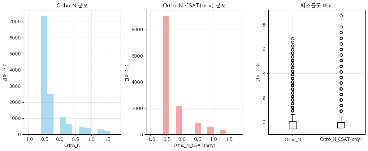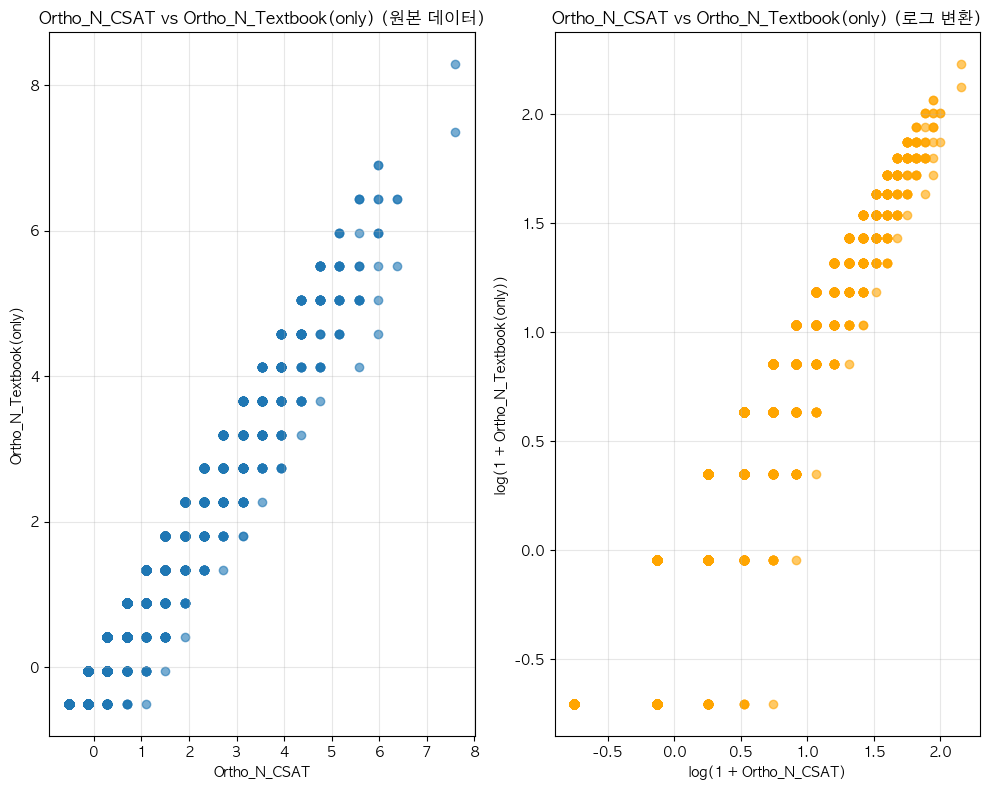 단어 빈도수 상관관계 분석 결과 ================================== 📊 기본 통계: 데이터 개수: 16354 Ortho_N_CSAT(only) - 평균: -0.00, 표준편차: 1.00 Ortho_N - 평균: 0.00, 표준편차: 1.00 🔗 상관계수: 피어슨 상관계수: 0.9364 (p-value: 0.0000) 스피어만 상관계수: 0.8684 (p-value: 0.0000) 켄달 타우: 0.8211 (p-value: 0.0000) 📝 해석: 통계적 유의성: 매우 유의함 (p < 0.001) 상관관계 강도: 강한 양의 상관관계 ==================================ELP vs KE_TEXTBOOK(수정해야함)