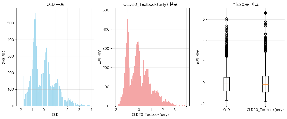 단어 빈도수 상관관계 분석 결과 ================================== 📊 기본 통계: 데이터 개수: 11767 OLD - 평균: 0.00, 표준편차: 1.00 OLD20_Textbook(only) - 평균: 0.00, 표준편차: 1.00 🔗 상관계수: 피어슨 상관계수: 0.9713 (p-value: 0.0000) 스피어만 상관계수: 0.9741 (p-value: 0.0000) 켄달 타우: 0.8766 (p-value: 0.0000) 📝 해석: 통계적 유의성: 매우 유의함 (p < 0.001) 상관관계 강도: 강한 양의 상관관계 ==================================