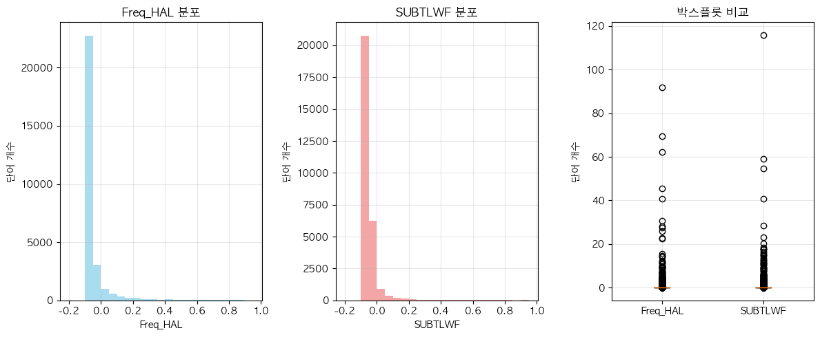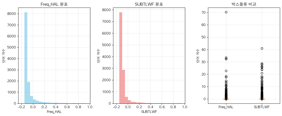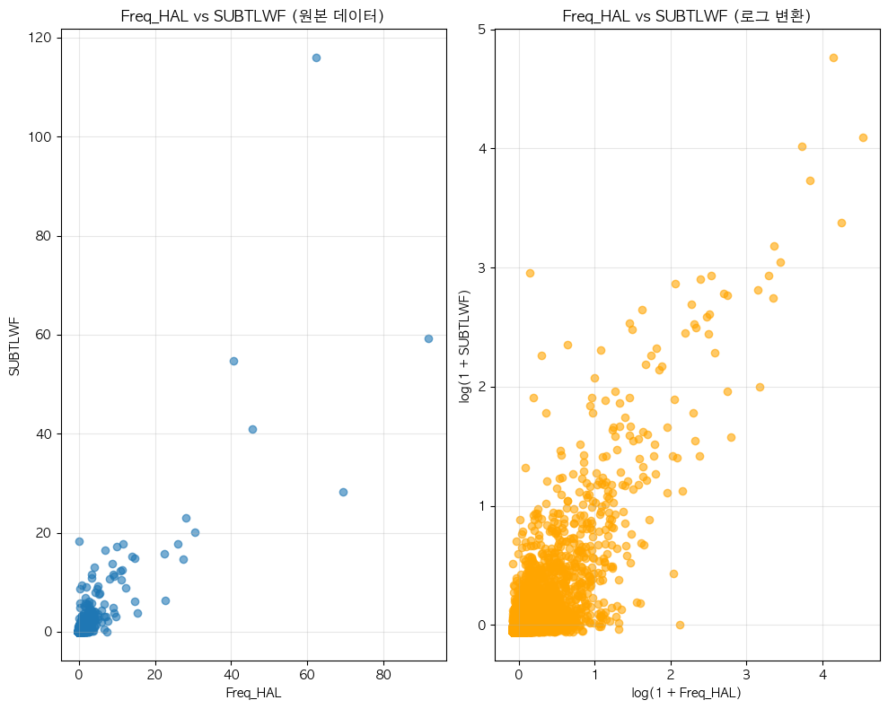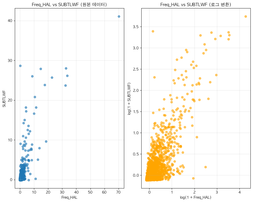 단어 빈도수 상관관계 분석 결과 ================================== 📊 기본 통계: 데이터 개수: 12372 Freq_HAL - 평균: -0.00, 표준편차: 1.00 SUBTLWF - 평균: 0.00, 표준편차: 1.00 🔗 상관계수: 피어슨 상관계수: 0.8104 (p-value: 0.0000) 스피어만 상관계수: 0.8511 (p-value: 0.0000) 켄달 타우: 0.6660 (p-value: 0.0000) 📝 해석: 통계적 유의성: 매우 유의함 (p < 0.001) 상관관계 강도: 강한 양의 상관관계 ==================================