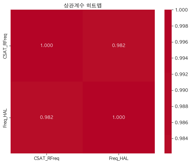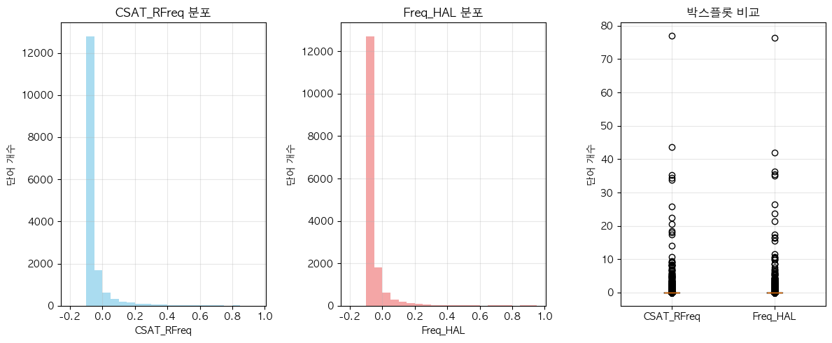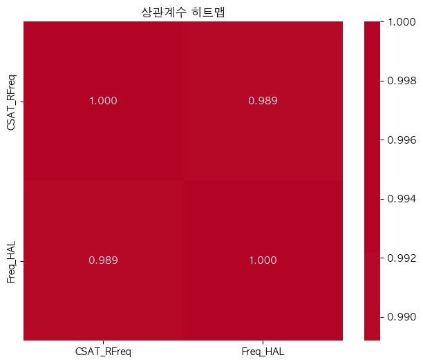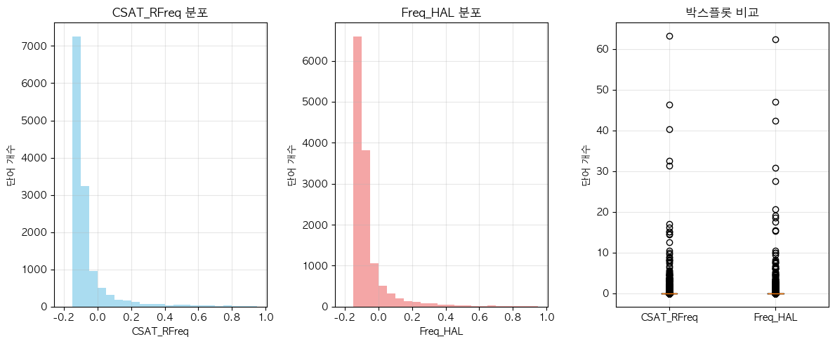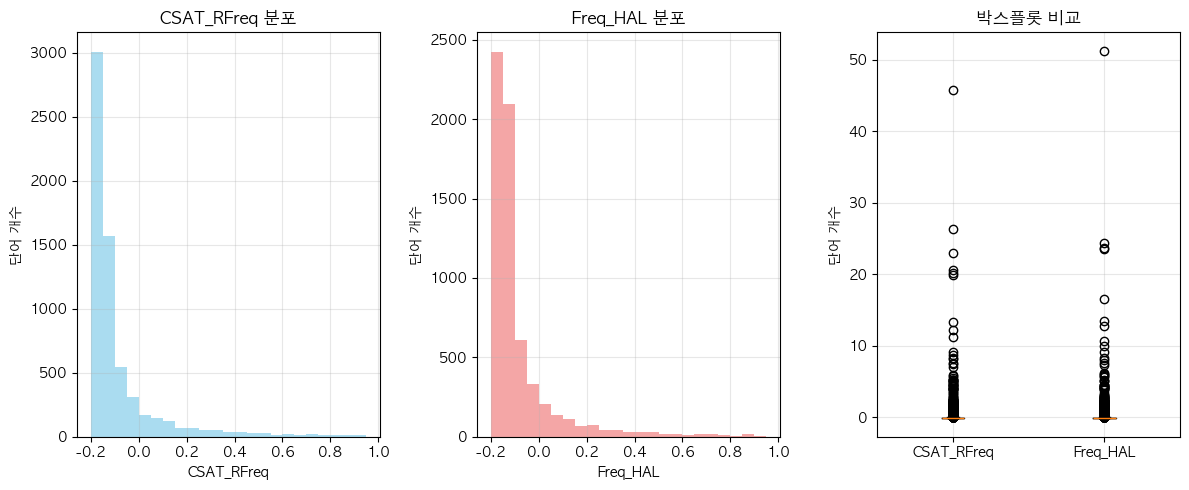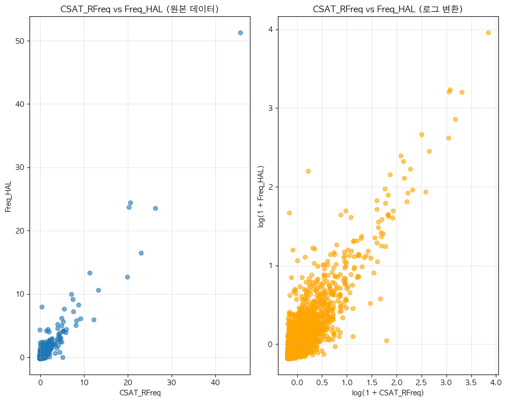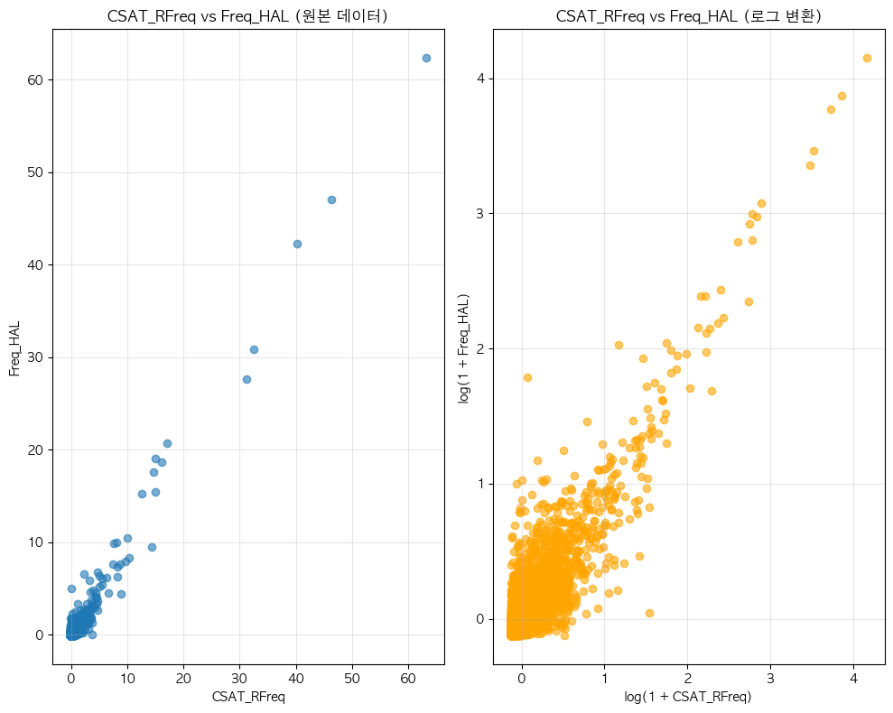 단어 빈도수 상관관계 분석 결과 ================================== 📊 기본 통계: 데이터 개수: 6507 CSAT_RFreq - 평균: 0.00, 표준편차: 1.00 Freq_HAL - 평균: 0.00, 표준편차: 1.00 🔗 상관계수: 피어슨 상관계수: 0.9532 (p-value: 0.0000) 스피어만 상관계수: 0.7961 (p-value: 0.0000) 켄달 타우: 0.6253 (p-value: 0.0000) 📝 해석: 통계적 유의성: 매우 유의함 (p < 0.001) 상관관계 강도: 강한 양의 상관관계 ==================================