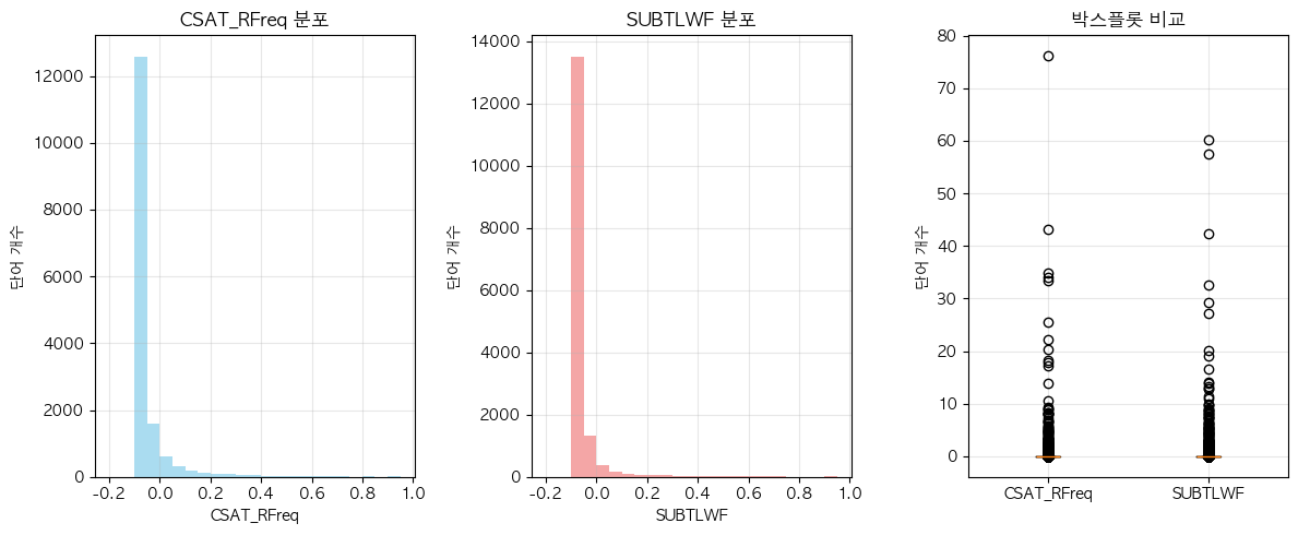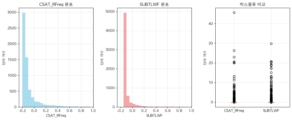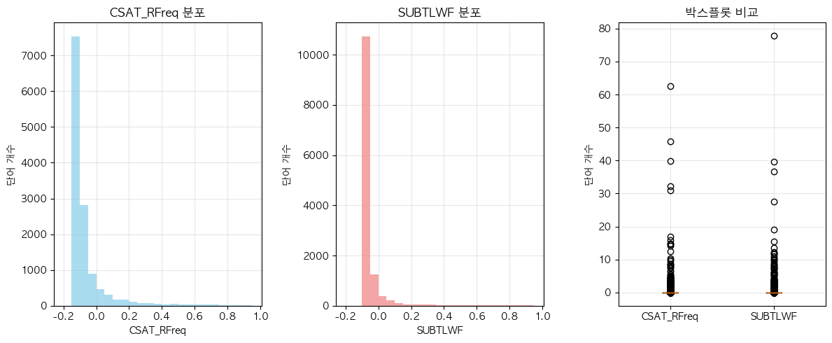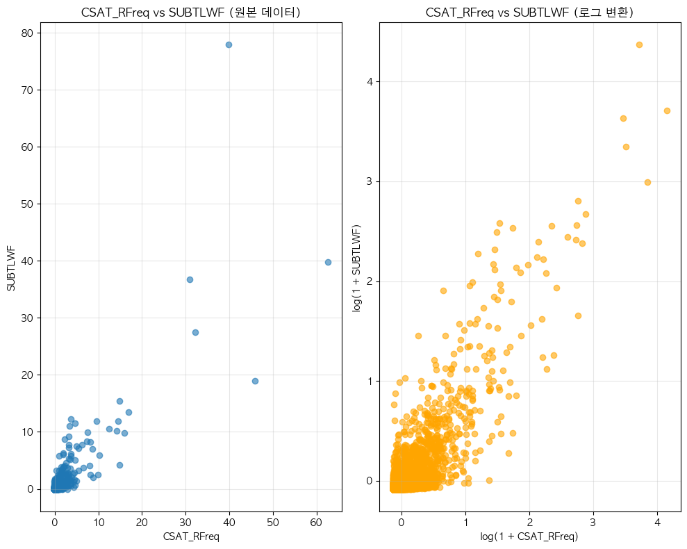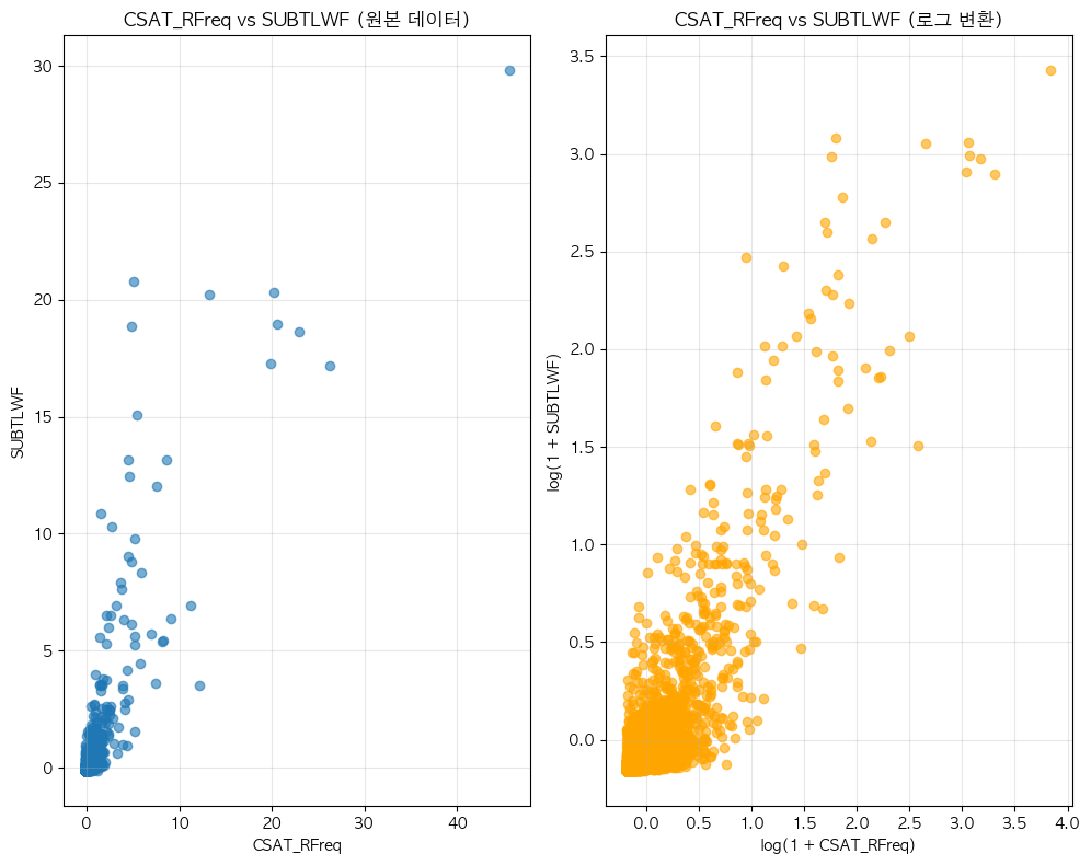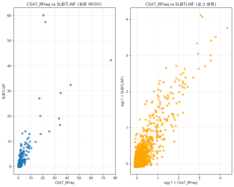 단어 빈도수 상관관계 분석 결과 ================================== 📊 기본 통계: 데이터 개수: 6483 CSAT_RFreq - 평균: 0.00, 표준편차: 1.00 SUBTLWF - 평균: 0.00, 표준편차: 1.00 🔗 상관계수: 피어슨 상관계수: 0.8561 (p-value: 0.0000) 스피어만 상관계수: 0.7395 (p-value: 0.0000) 켄달 타우: 0.5668 (p-value: 0.0000) 📝 해석: 통계적 유의성: 매우 유의함 (p < 0.001) 상관관계 강도: 강한 양의 상관관계 ==================================
