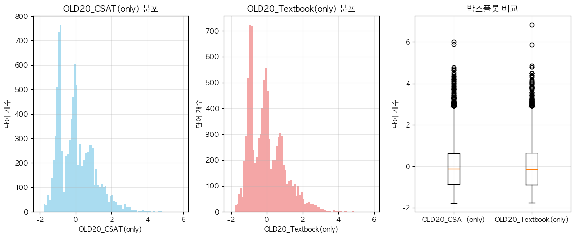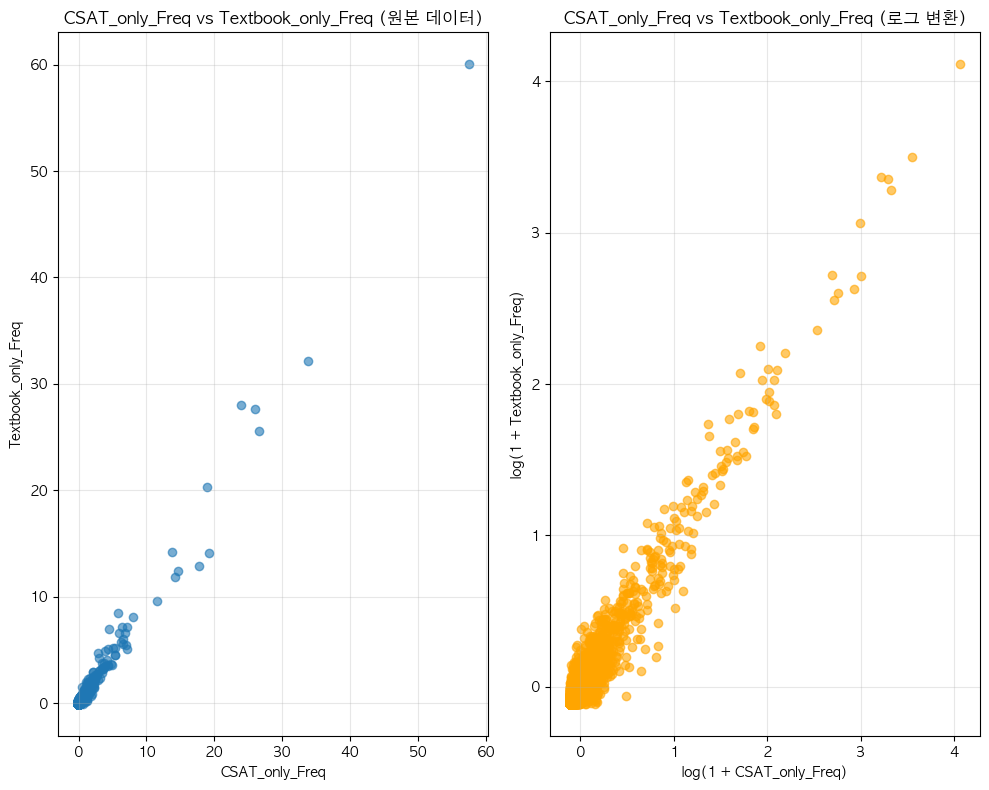 단어 빈도수 상관관계 분석 결과 ================================== 📊 기본 통계: 데이터 개수: 9456 OLD20_CSAT(only) - 평균: -0.00, 표준편차: 1.00 OLD20_Textbook(only) - 평균: 0.00, 표준편차: 1.00 🔗 상관계수: 피어슨 상관계수: 0.9912 (p-value: 0.0000) 스피어만 상관계수: 0.9912 (p-value: 0.0000) 켄달 타우: 0.9357 (p-value: 0.0000) 📝 해석: 통계적 유의성: 매우 유의함 (p < 0.001) 상관관계 강도: 강한 양의 상관관계 ==================================