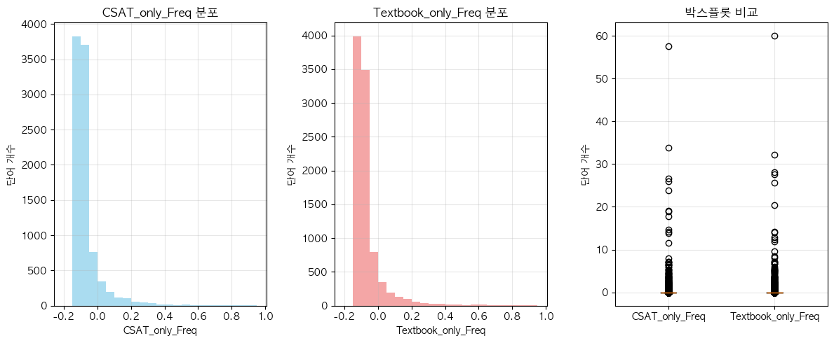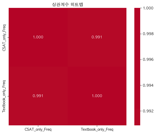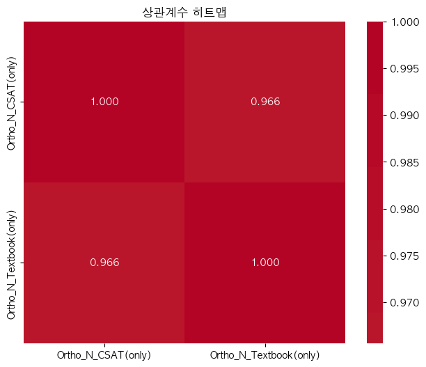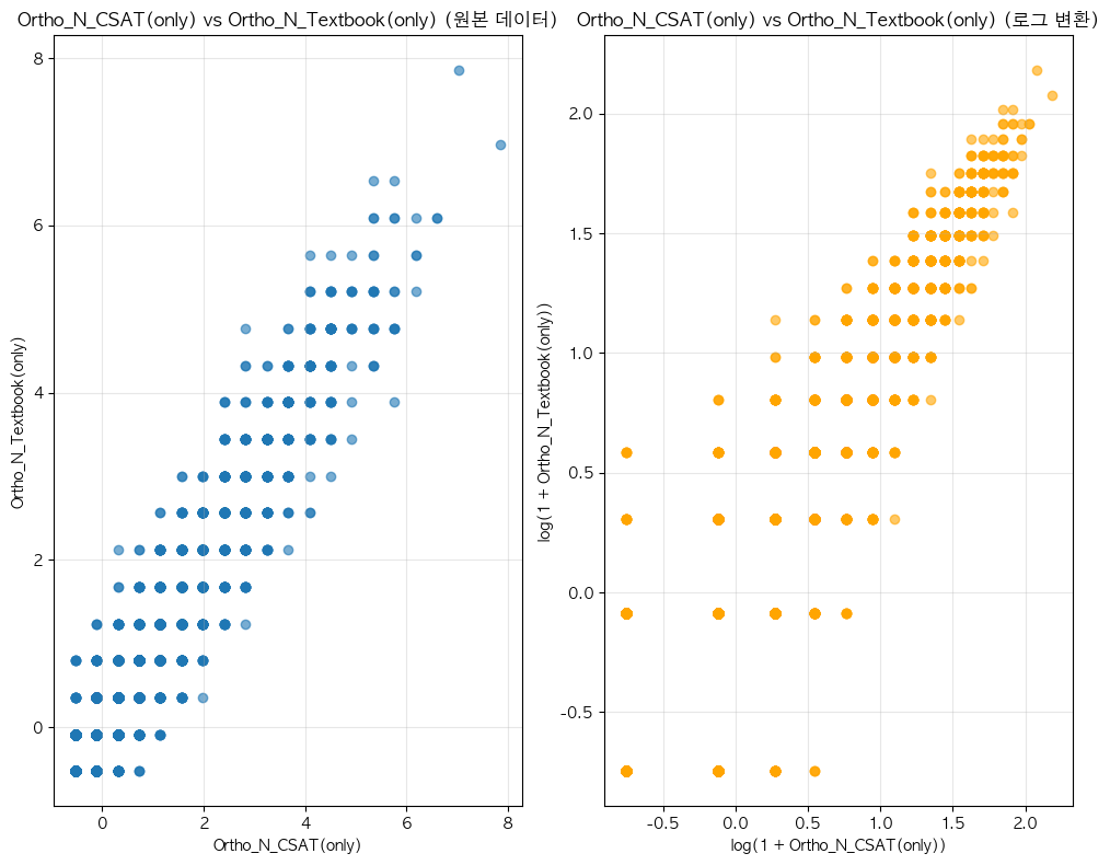 단어 빈도수 상관관계 분석 결과 ================================== 📊 기본 통계: 데이터 개수: 9456 CSAT_only_Freq - 평균: 0.00, 표준편차: 1.00 Textbook_only_Freq - 평균: -0.00, 표준편차: 1.00 🔗 상관계수: 피어슨 상관계수: 0.9904 (p-value: 0.0000) 스피어만 상관계수: 0.7509 (p-value: 0.0000) 켄달 타우: 0.5997 (p-value: 0.0000) 📝 해석: 통계적 유의성: 매우 유의함 (p < 0.001) 상관관계 강도: 강한 양의 상관관계 ==================================Ortho_N