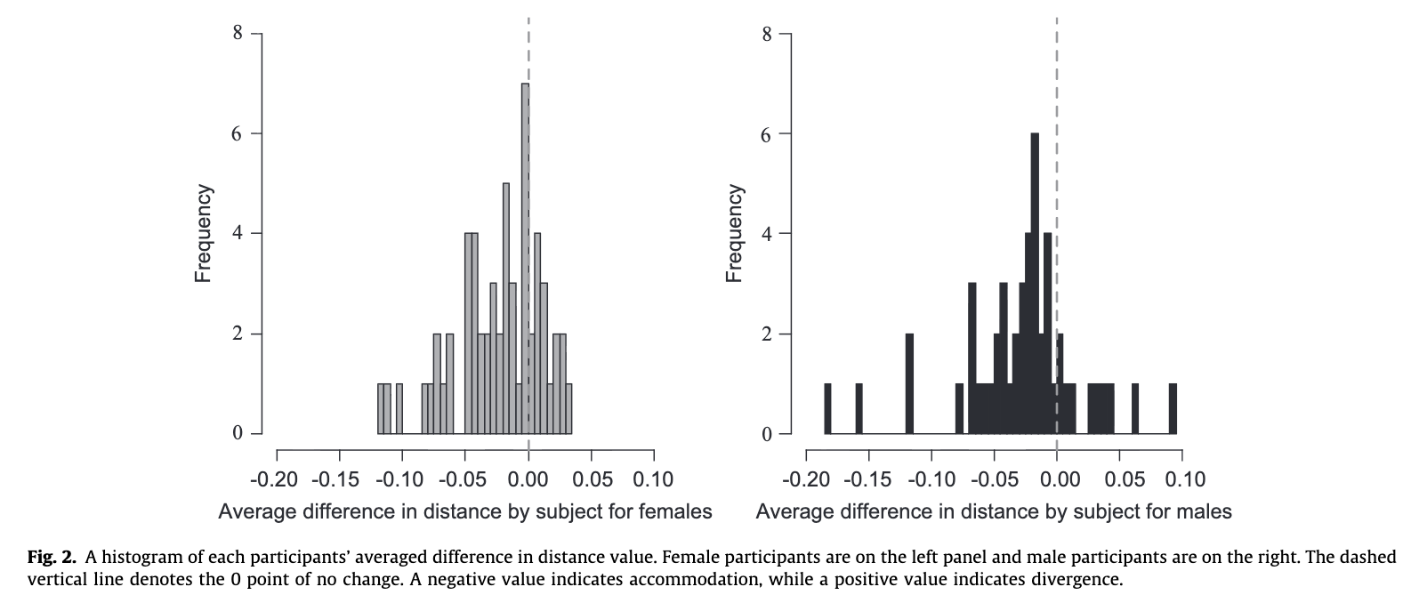 전반적으로 참가자들은 모델 화자의 모음 스펙트럼에 가까워지는 음성 모방 현상을 보였습니다(음향적 거리가 유의하게 감소).