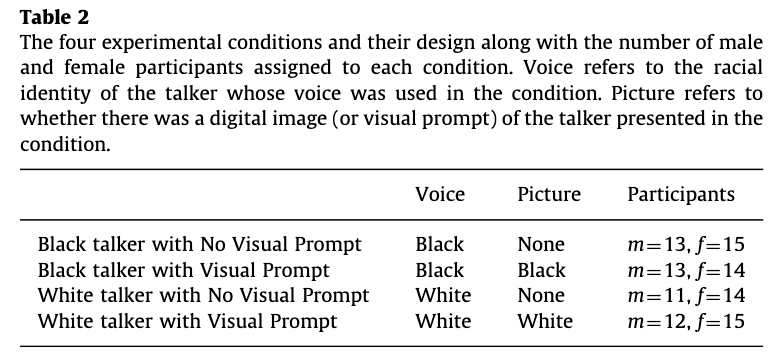 자극 및 조건: 50개의 저빈도 단음절 단어(모음 /i, æ, >, o, u/)가 사용되었고, 두 명의 모델 화자(1 Black, 1 White)가 녹음한 발화를 기준.
