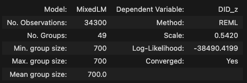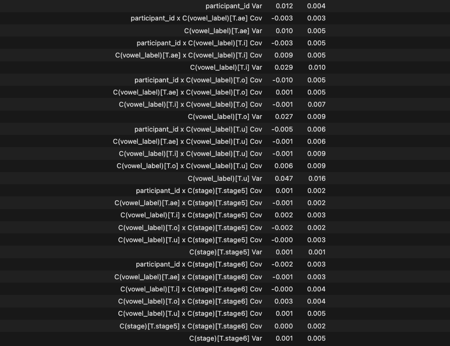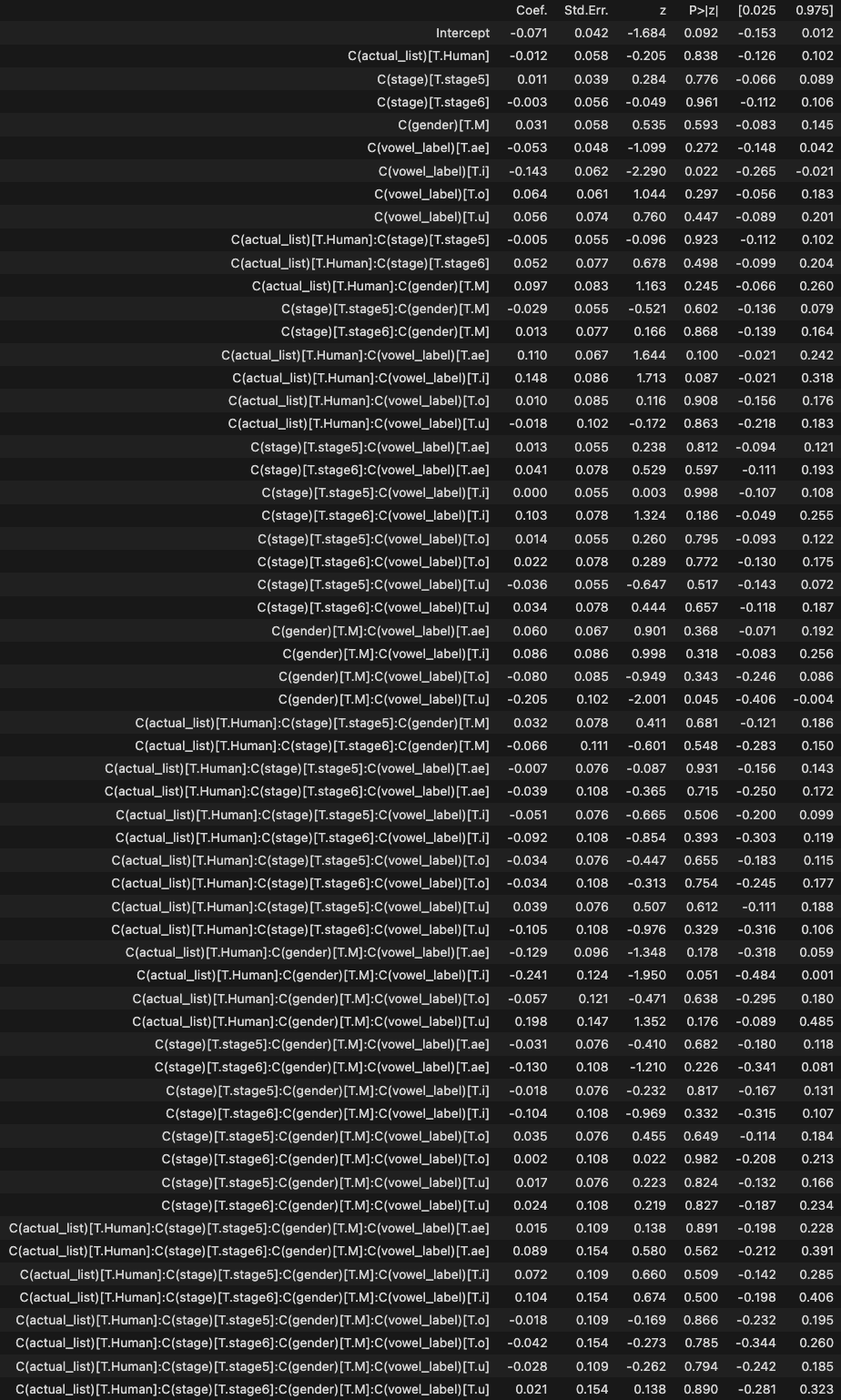 # LMM formula = 'DID_z ~ C(actual_list)*C(stage)*C(gender)*C(vowel_label)' model = MixedLM.from_formula(formula, data=analysis_df, groups='participant_id', re_formula='~C(vowel_label) + C(stage)' ).fit() # groups에 id print("--- Statsmodels를 이용한 ANOVA 결과 ---") model.summary()