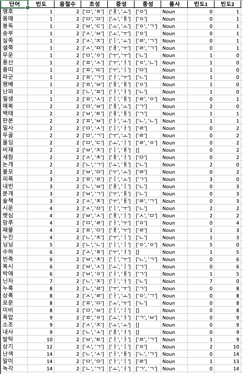 - 첫 음절에 ㅁ, ㄴ, ㅍ, ㅂ, ㅅ 이 각각 10개씩 분포